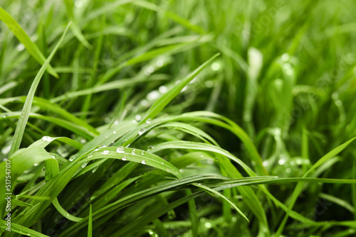 Beautiful bright green grass with water drops outdoors, closeup