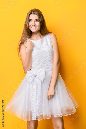 lady, fashion, summer, dress, stylish, fashionable, beauty, beautiful, female, woman, girl, charming, attractive, person, people, dreamy, romantic, thoughtful, long hair, happy, smile, smiling, young, youth, cheerful, clothes, thought, style, white, yellow, background, posing, pose, studio, inside, indoor, indoor, gorgeous, cute, model, pure, bright, colourful, happiness, emotional, positive