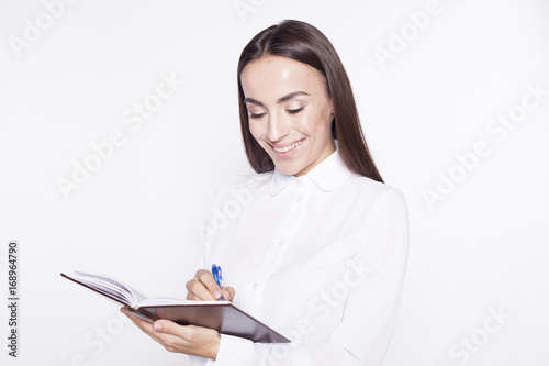 Beautiful brunette Business Woman writes the notes in notebook isolated on white background.