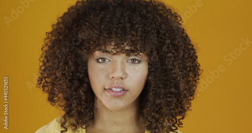 Beautiful brunette model on yellow. Curly hair. Brazilian young woman.