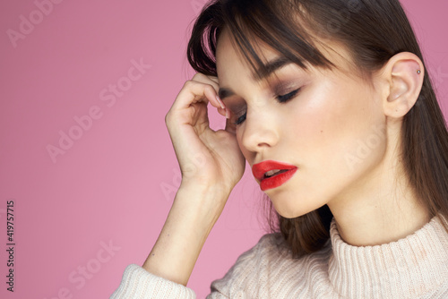 Beautiful brunette red lips white blouse close-up attractive view pink background