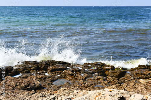 Beautiful bursts of foam waves on the seashore. White foam and bubbles beat against the rocky beach. Turquoise waves.