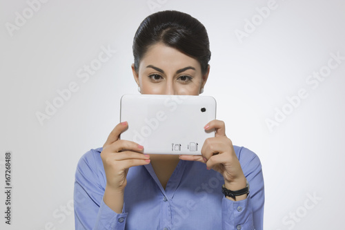 beautiful woman, black hair, business, businessperson, businesswoman, color image, communication, computer, concentration, connection, copy space, cut-out, front view, grey background, holding, horizontal, cyberspace, looking, occupation, one person, photo, professional occupation, shirt, studio shot, technology, well-dressed, wireless technology, working, young adult, missy