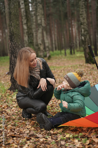 beautiful Caucasian mother and little child having fun in autumn Park, walking.