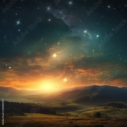 Beautiful celestial sky in dreamy fantasy with bright star in the sky over nature landscape. distinct generative AI