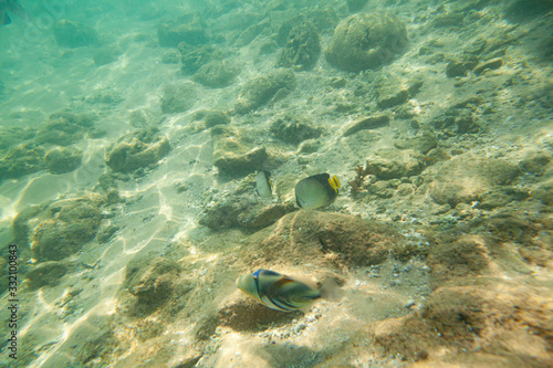 Beautiful colored fish swim underwater in the Indian Ocean among the stones.