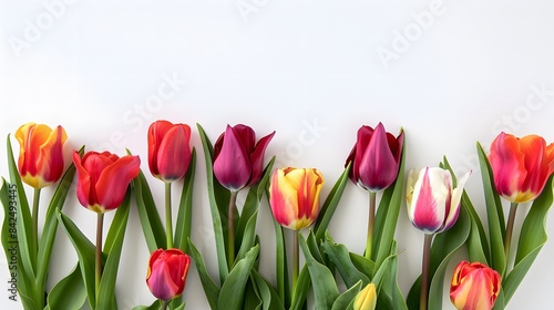 Beautiful composition of spring flowers and leaves on white background with copy space
