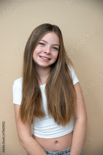 beautiful, cool, cute tween, teenager girl with long hair is posing in front of brown background