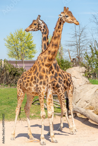 Beautiful couple of giraffes in a zoo, tall African hoofed mammal belonging to the genus Giraffa, vertical