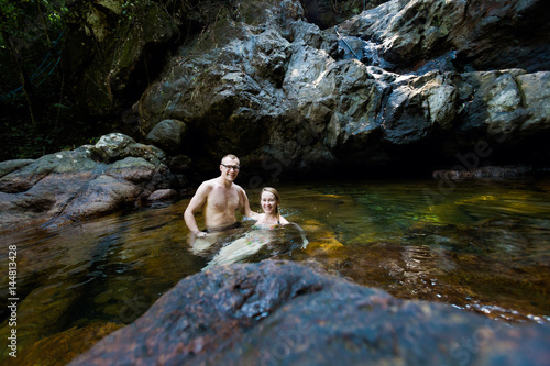 Beautiful couple swimming in waterfall