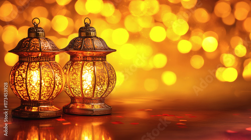 Beautiful decorative lanterns glowing against a warm, bokeh background