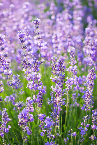 Beautiful detail of a fragrant blooming field of lavender flowers. Can be used for agriculture, perfume, cosmetics SPA, medical industries and diverse advertising materials or greeting card