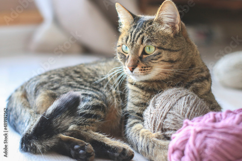 Beautiful domestic striped cat plays with knitting yarn