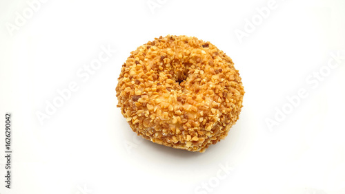 Beautiful doughnuts covered in chopped nuts glaze on white background.