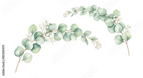 eucalyptus, leaf, flower, watercolor, painting, green, white, background, serene, natural, beauty, foliage, tree branch, stem, floral, decoration, botanical, illustration, artistic, soft, delicate, elegant, simple, minimalist