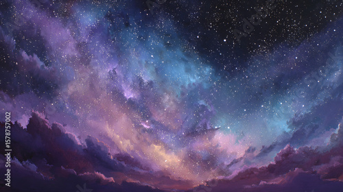 Beautiful fantasy starry night sky, blue and purple colorful, galaxy and aurora 4k wallpaper. cosmic watercolor illustration. Colorful space background with stars