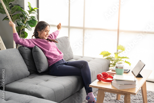 beautiful female asian smiling casually sitting on sofa coach stretching body and arms feeling comfortable playing, wearing warm clothing, wooly jumper socks and trousers, relaxing, free time, day off