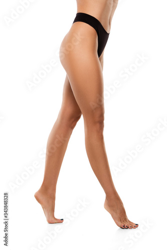 Beautiful female legs, buttlocks and belly isolated on white background. Beauty, cosmetics, spa, depilation, treatment and fitness concept. Sportive, sensual body with well-kept skin in underwear.