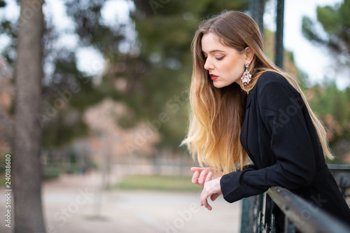 woman, fence, park, leaning, looking away, young, lifestyle, leisure, rest, elegant, relax, female, style, trendy, calm, tranquil, serene, peaceful, pretty, beautiful, attractive, charming, lovely, cute, make-up, recreation, outfit, gorgeous, honed, lady, idylli, harmony, long hair, railing, blurred background, horizontal, outdoors, half face, copy space