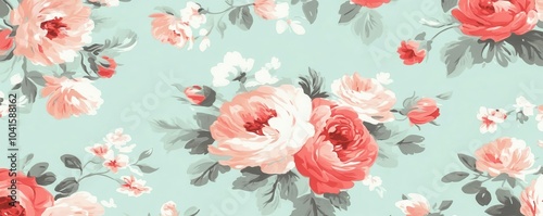 Beautiful floral pattern featuring soft pink and coral roses against a mint green background, perfect for elegant designs.