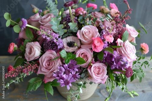 flower, bouquet, rose, pink, purple, romantic, arrangement, blossom, floral, centrepiece, decoration, gift, love, anniversary, birthday, wedding, celebration, valentine, mother, day, spring, summer, beauty, nature, colourful, vibrant, fresh, blooming, flower petals, leaf, greenery, vase, rustic, table, wood, background, still, life, studio, shot, close, up, design, elegance, style, pastel, soft, delicate, fragrant