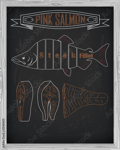 Beautiful fresh salmon closeup side view drawn with chalk. Pink