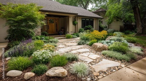 Beautiful front yard landscape design with diverse plants, stone walkway, and lush greenery creating a serene outdoor environment for relaxation