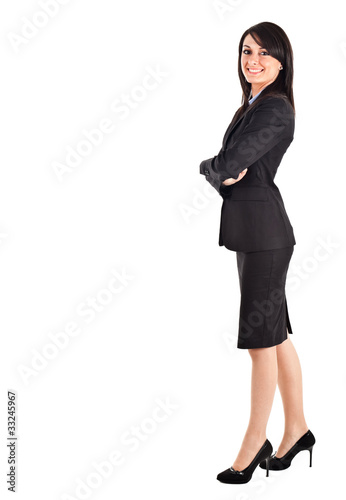 businesswoman, business, woman, smiling, isolated, confident, length, white, full, hand, beautiful, beauty, brunette, caucasian, elegant, entrepreneur, female, happy, lady, lovely, portrait, positive, pretty, professional, standing, success, successful, young