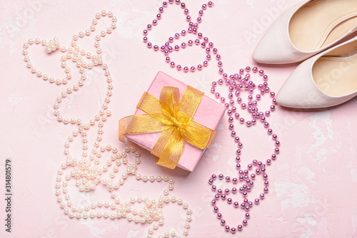 Beautiful gift with beads and high-heels on color background. International Women's Day celebration