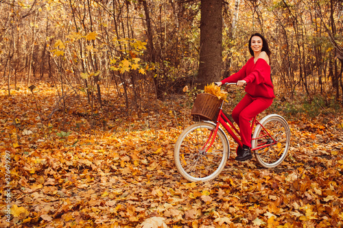 beautiful girl - brunette walks in the autumn forest on a bicycle, golden autumn