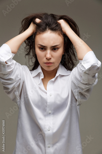 Beautiful girl in a white shirt shows emotions - headache. On a light background.