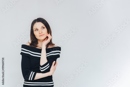 woman, young, portrait, beauty, white, brunette, isolated, happy, pretty, smile, person, smiling, people, business, face, model, businesswoman, cheerful, studio, hair, hand, expression, fashion, cute, thinking