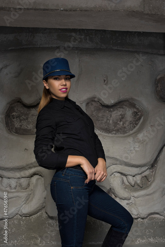 woman, fashion, wall, jean, beauty, model, person, hair, teenage, people, sitting, urban, lifestyle, street, standing, style, outdoors, brick, 1, teenage, lady, brunette, casual attire, posing