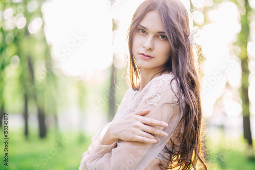 beautiful girl in wedding dress beige with patterns, lace, smiling, looking at nature
