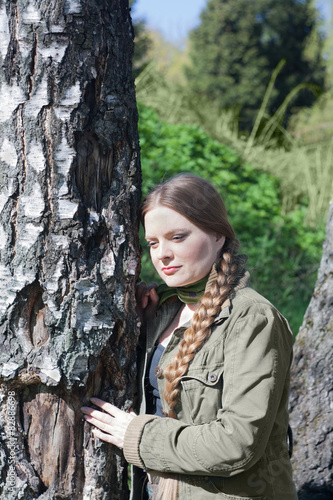 braid, plait, girl, woman, 1, only, alone, sunlight, smile, thinking, long hair, portrait, outside, trunk, birch, nature, blond, white, caucasian, happy, calm, quiet, tranquil, russian, slav, 30s, day, military