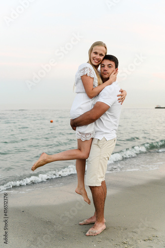 beautiful girl with white hair kisses her husband on the cheek on the beach near the ocean at sunset. romantic walk. vacation of a young family. travel to the sea.