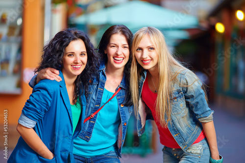 woman, girl, friends, talk, laughing, smile, happy, walk, street, candid, casual attire, city, fun, youth, young, beautiful, portrait, evening, day, colourful, jean, lifestyle, communicate, three, person, people, human, female, pretty, fashion, outside, natural, friendship, culture, exterior, building, joy, joyful, delight, happiness, cute, expression, emotion, relation, human relationships, positive, life, active, slim