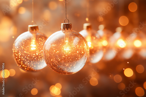 Beautiful Glass Christmas Ornaments filled with Golden Lights, hanging in festive, glowing arrangement. Perfect for Holiday decor, Christmas themes, or seasonal celebrations. New Year Concept