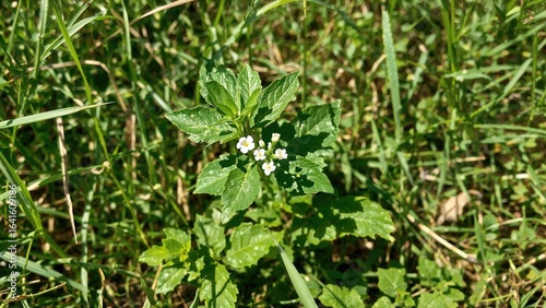 Beautiful green grass and leaves surrounding blooming kantkari flowers