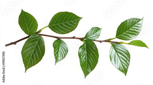 Beautiful green leaves on a branch isolated on a white background, showcasing the natural texture and freshness of the leaves