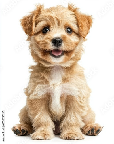 Beautiful happy reddish havanese puppy dog is sitting frontal , isolated on white background, , copy space for text,