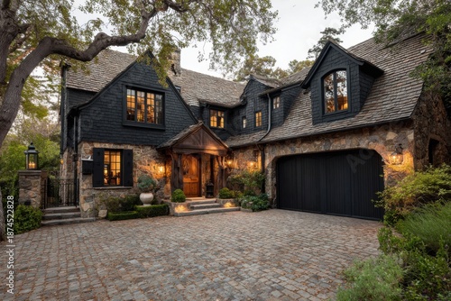 home, house, stone, wood, exterior, evening, neighbourhood, light, entrance, door, window, tree, glow, warmth, design, landscaping, architecture, pathway, garage, driveway, ambience, nature, cosy, welcome, style, lighting, peaceful, charme, residential, family, garden, area, brick, outside, scenic, light, aesthetic, detail, atmosphere, inviting, beauty, setting