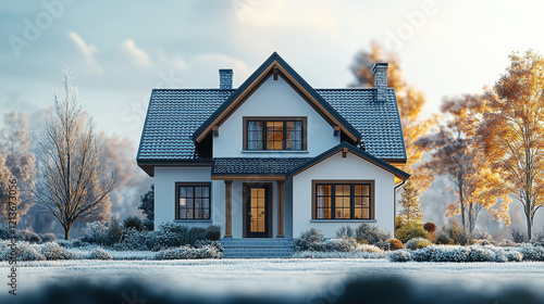 beautiful house with detailed architectural elements, surrounded by trees and serene landscape. warm light creates welcoming atmosphere in this picturesque setting