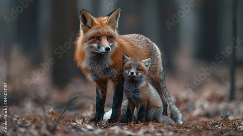 Beautiful image of a mother fox and her cub standing together in a forest, surrounded by fallen leaves, displaying touching wildlife family bonding