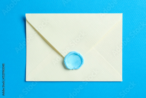 Beautiful invitation envelope with wax seal on light blue background, top view