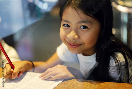 Beautiful kid girl writing homework in summer holiday at coffee cafe.