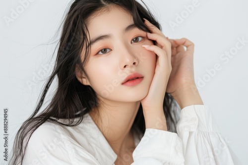 beautiful Korean womanwith long hair, wearing white and touching the skin while looking at the camera with a clean background