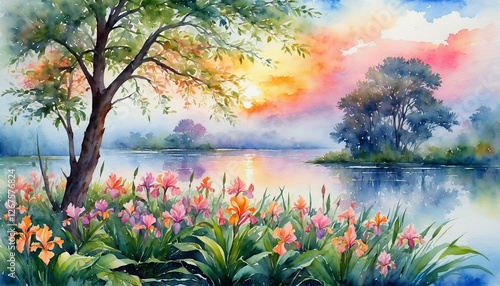 Beautiful landscape colorful flowers blooming by the lake in sunrise, watercolor painting style, generative AI.