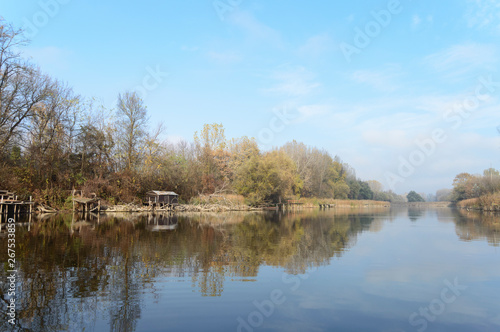 Beautiful landscape photo of Holt-Tisza river and riverside in Hungary. Autumn forest morning fog. Best place for fishing.