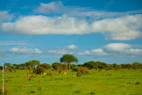 Beautiful landscape with animals, trees and mountains in Africa.